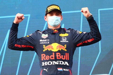 epa09143714 First placed Dutch Formula One driver Max Verstappen of Red Bull Racing celebrates on the podium after the Formula One Grand Prix Emilia Romagna at Imola race track, Italy, 18 April 2021. EPA/DAVIDE GENNARI