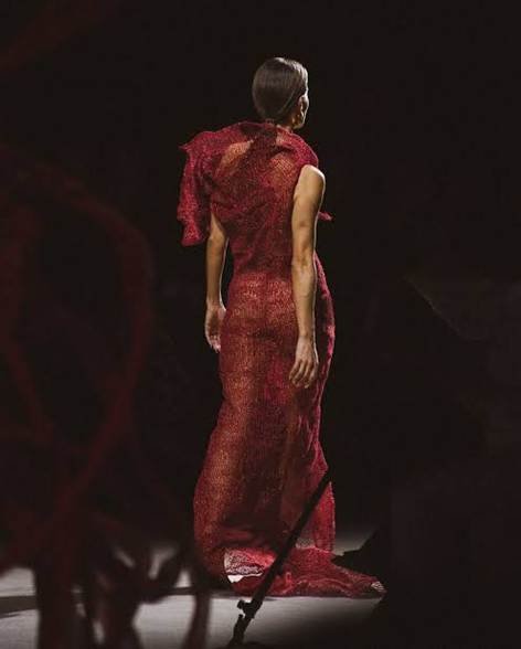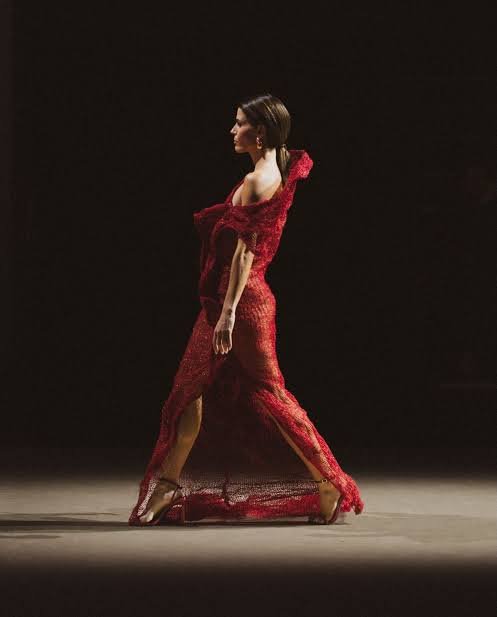 El vestido rojo que lució Claudia destacaba por un corte asimétrico que permitía el movimiento, reforzando la idea de que la prenda está “viva” y cuenta una historia al caminar. Se utilizaron superposiciones y bordados manuales para crear efectos tridimensionales y texturas que invitaban a ser tocadas y “leídas”. Los colores fueron elegidos para evocar diferentes tipos de “tinta” o estados de ánimo: